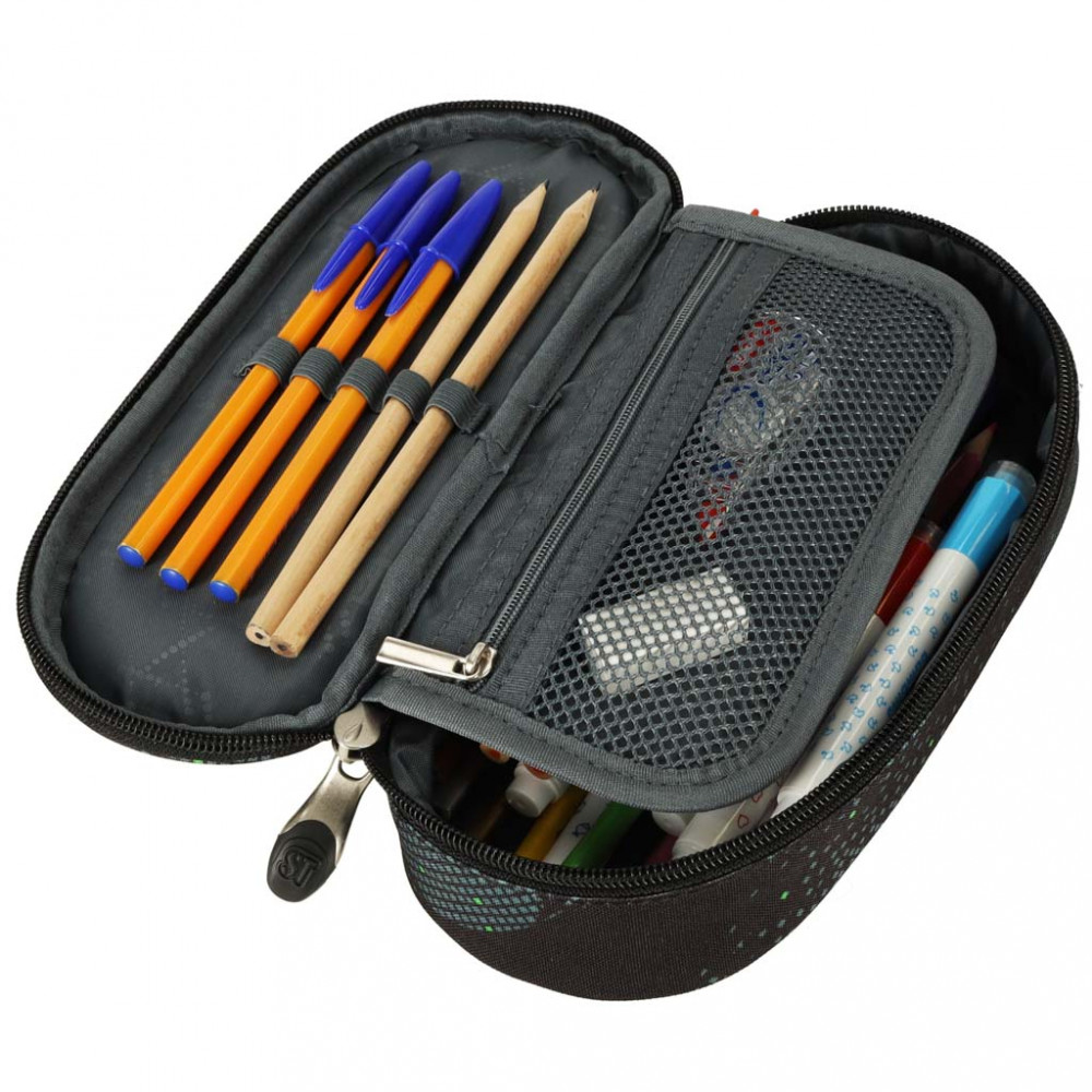• kiegészítő patentos fedél íróeszközöknek való helyiséggel és egy cipzáras zsebbel