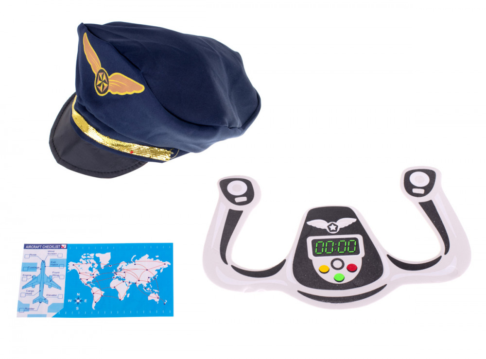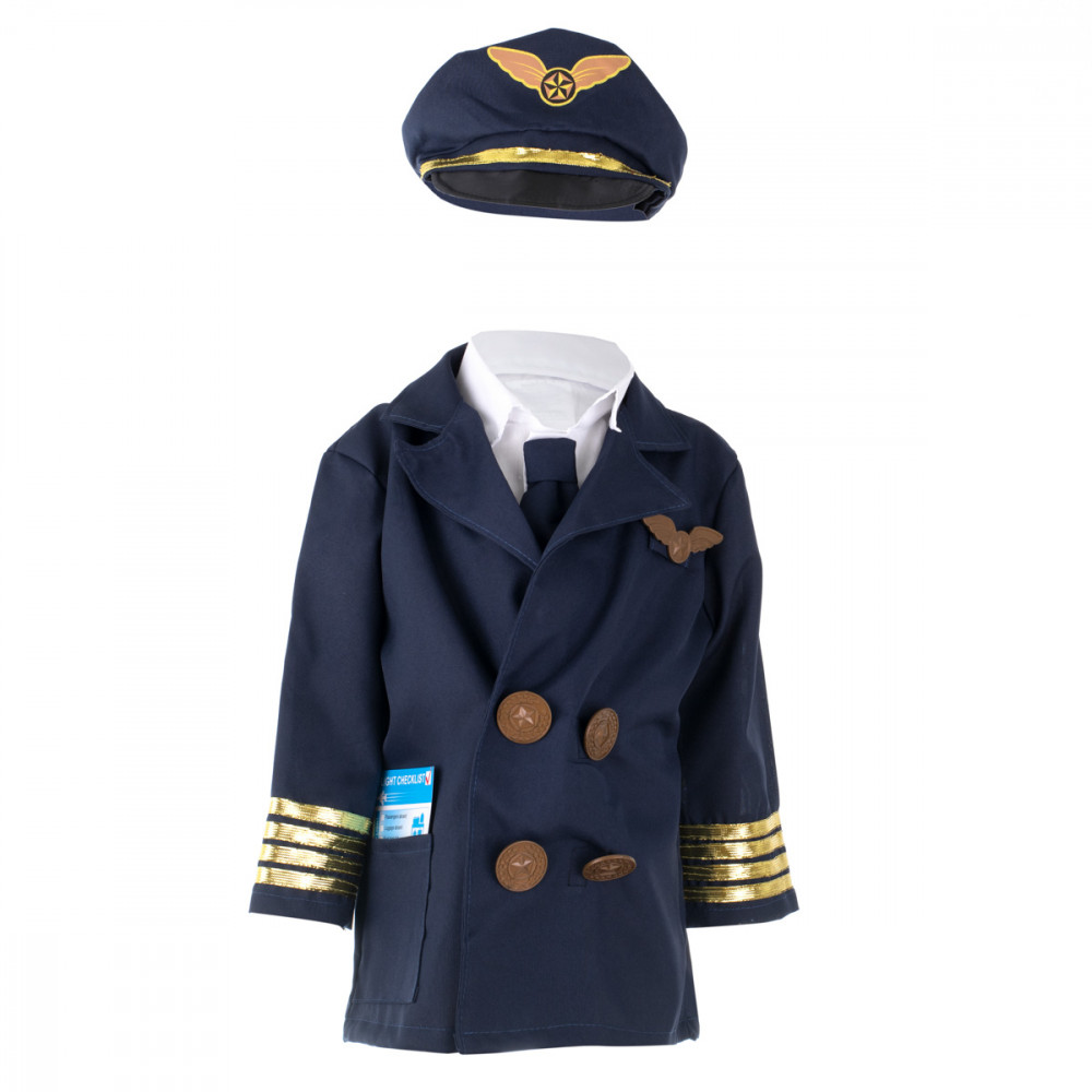 Többrészes pilótajelmez. Felszerelve egy igazi pilóta szükséges attribútumaival: kabát, sapka, kormánylapát és beszállási lista. Tökéletes fiúknak és lányoknak, pl. álruhaként farsangi bulira. 100% nejlonból készült.