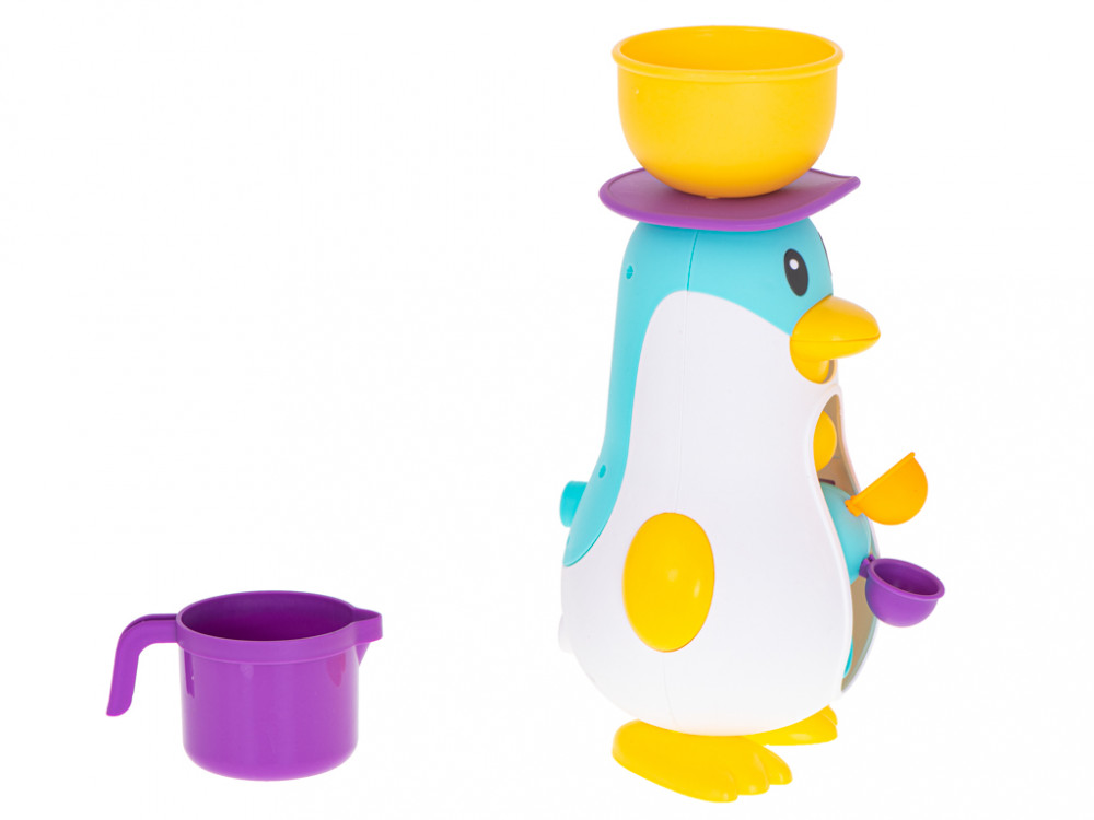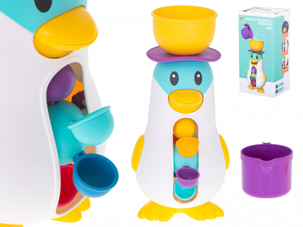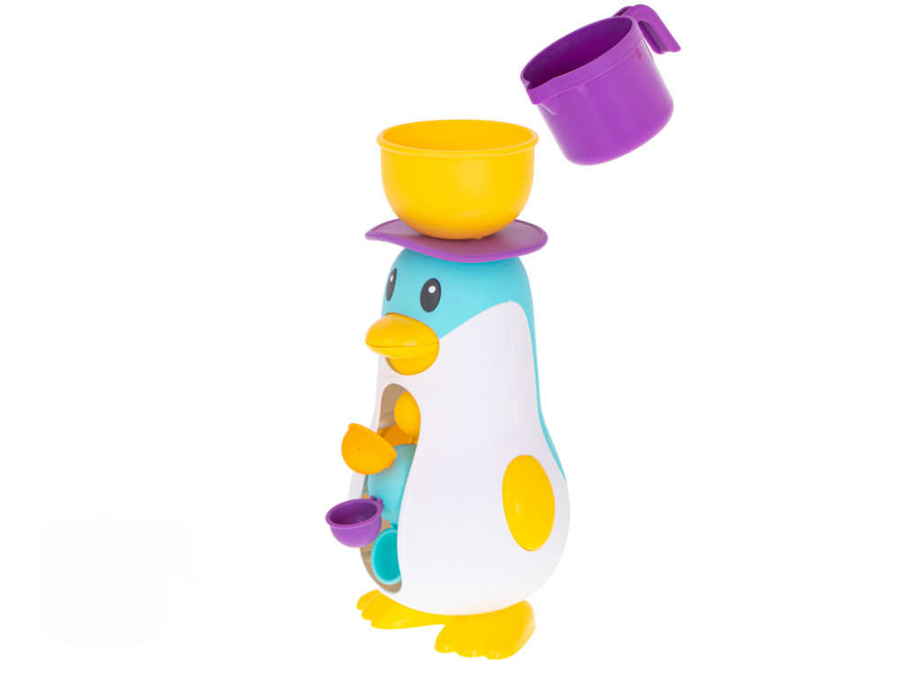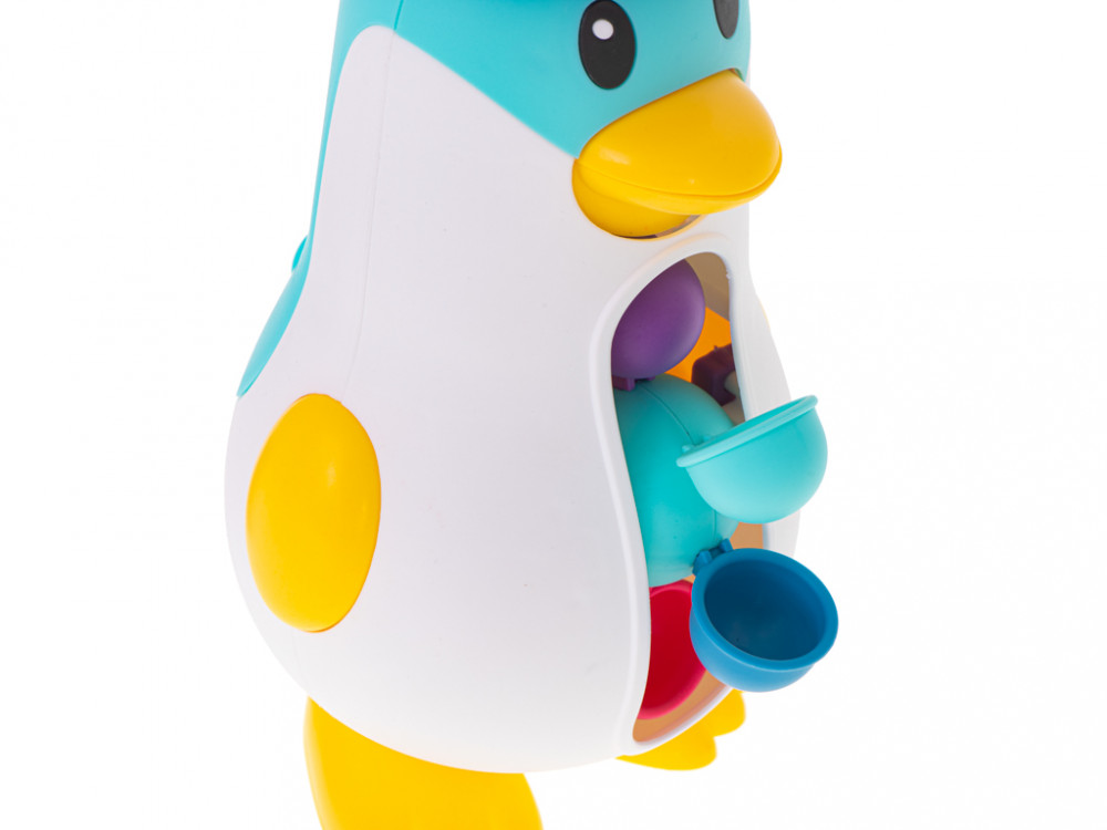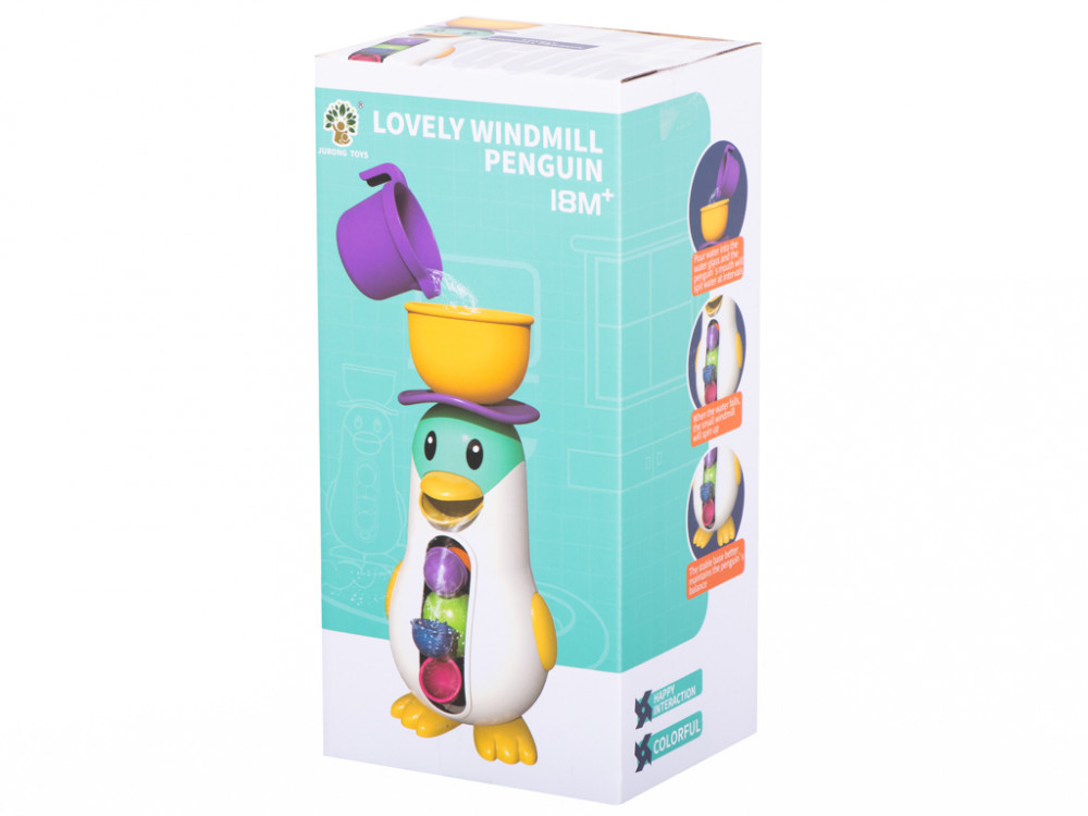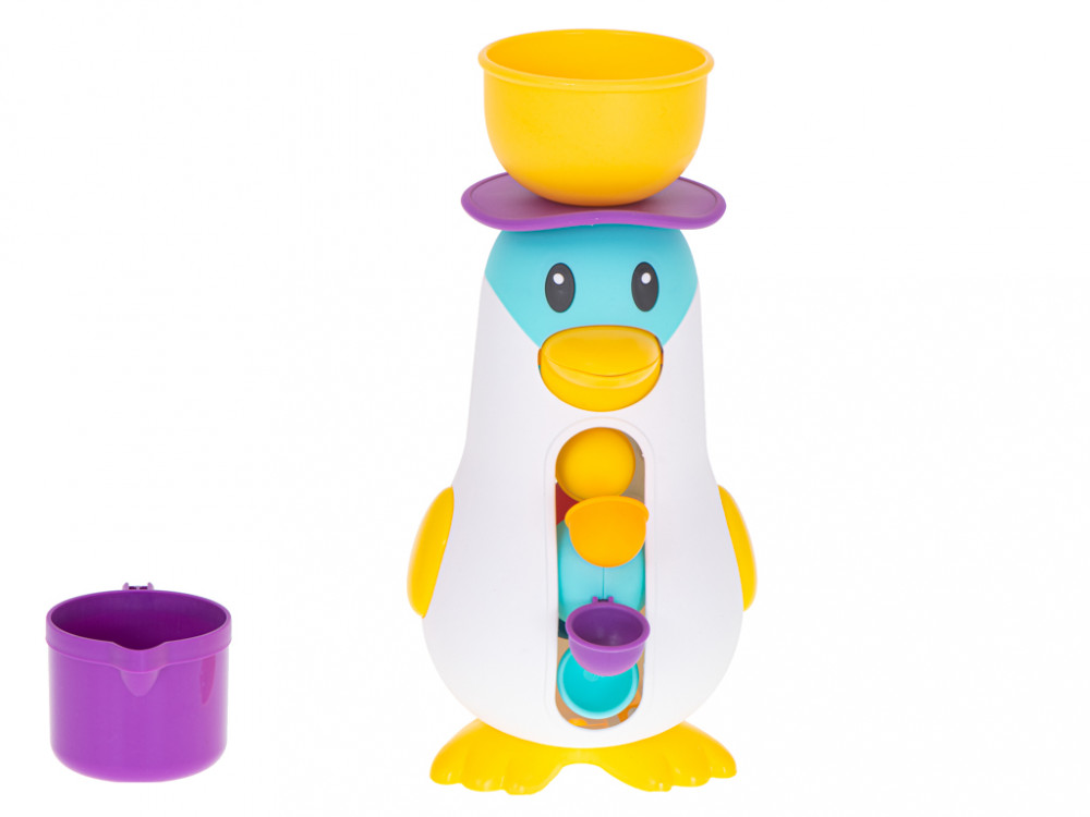Pingvin alakú fürdőjáték. Amikor a tálba vizet öntünk, működésbe lép a kereket mozgásba hozó mechanizmus. A praktikus tapadókorongnak köszönhetően a játék sík felületre rögzíthető. Kellemesebbé teszi a mindennapos fürdési időt. Méretek: 11x11x27cm.