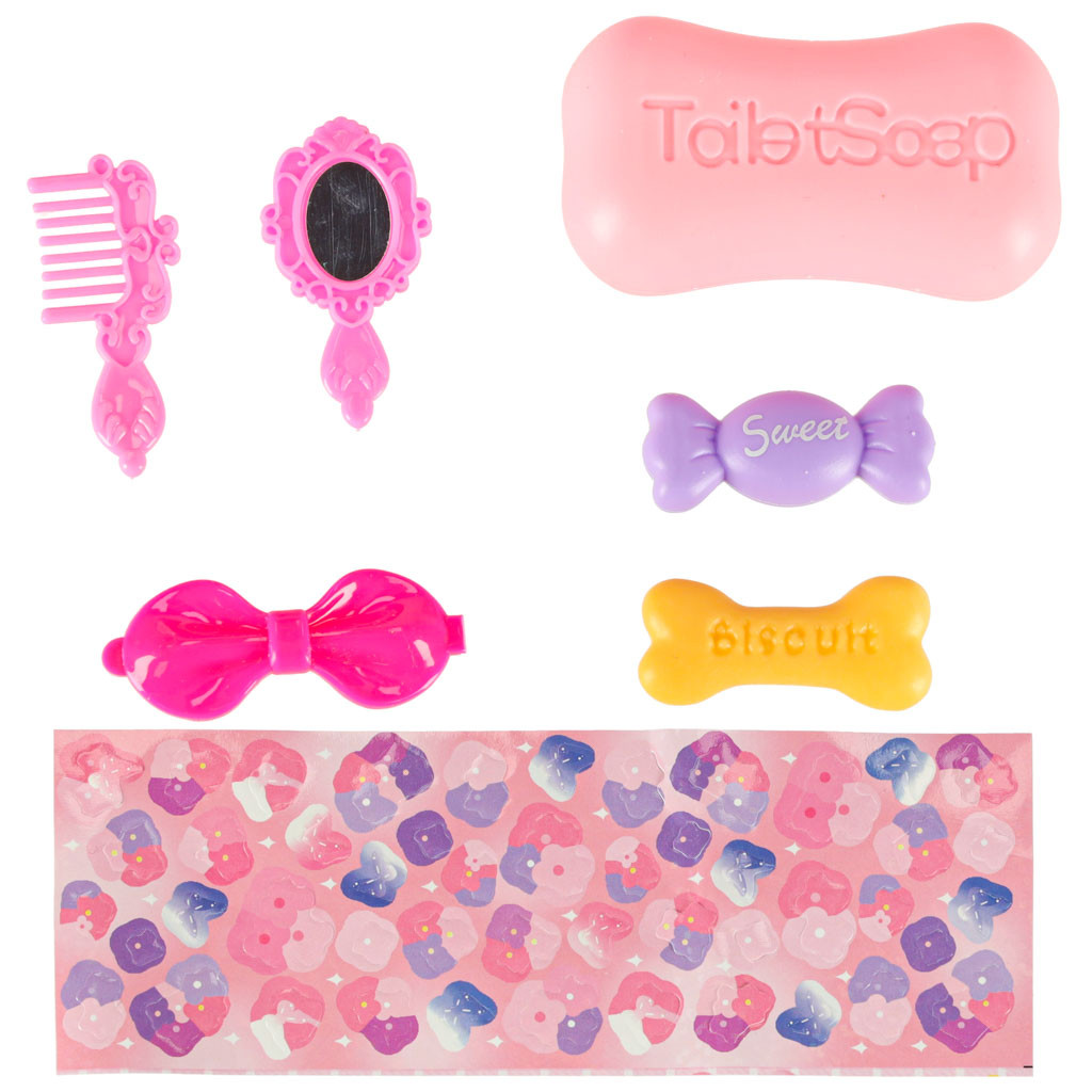 - Tartozékok: játékszappan, fésű, tükör, hajtű-kártya, cukorka, sütemény