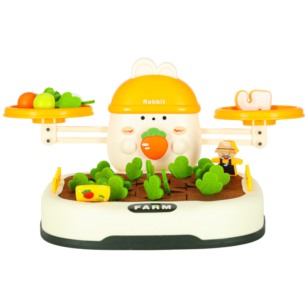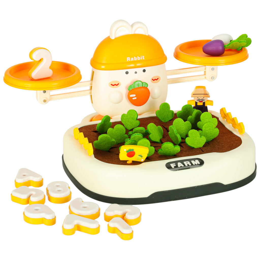 A készlet tetején egy imádnivaló nyuszi uralkodik, aki "őrzi" az egyensúlyt. A gyermek répákat vagy más tárgyakat halmozhat egymásra, hogy megőrizze az egyensúlyt, vagy szándékosan megbontja azt, miközben megtanulja a fizika és a logikus gondolkodás alapjait. A készlethez különleges számok is tartoznak - minden számhoz tartozik egy megfelelő súly, amely megfelel az ábrázolt számnak. Ez lehetővé teszi a kisgyermek számára a kísérletezést, a súlyok összehasonlítását és a számértékek gyakorlati megtanulását! Ez a játék nagyszerűen támogatja a számolás és az alapvető matematikai fogalmak elsajátítását.