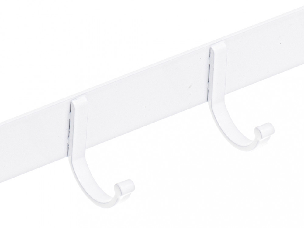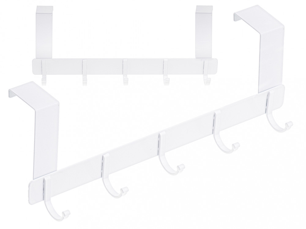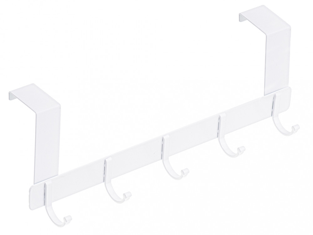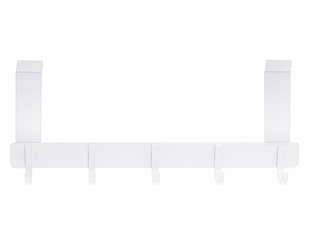Fém akasztó ajtóhorgokkal. 5 kampóval rendelkezik, hogy rendben tartsa a dolgokat. A fogas bármikor áthelyezhető egy másik ajtóra. Minden szabványos, legfeljebb 4,5 cm vastagságú ajtóhoz illeszkedik. Szín: fehér. Méretek: 32x4.5x12cm.