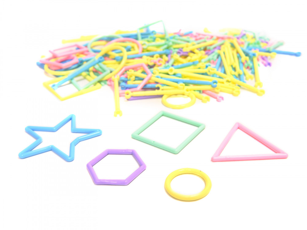 Színes, különböző formájú, műanyagból készült, színes blokkokból álló készlet.