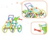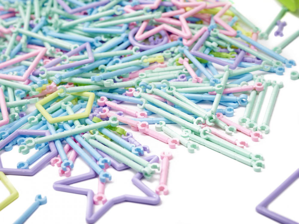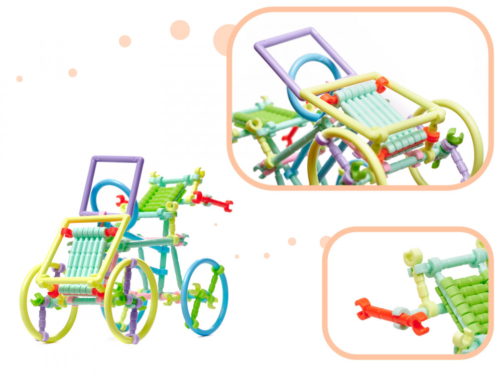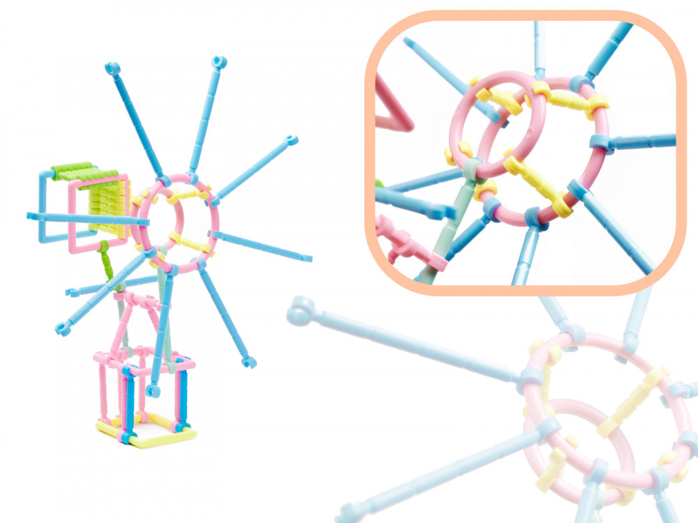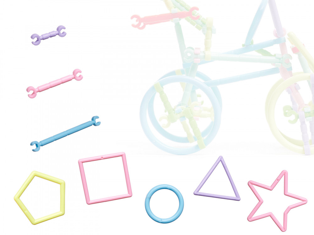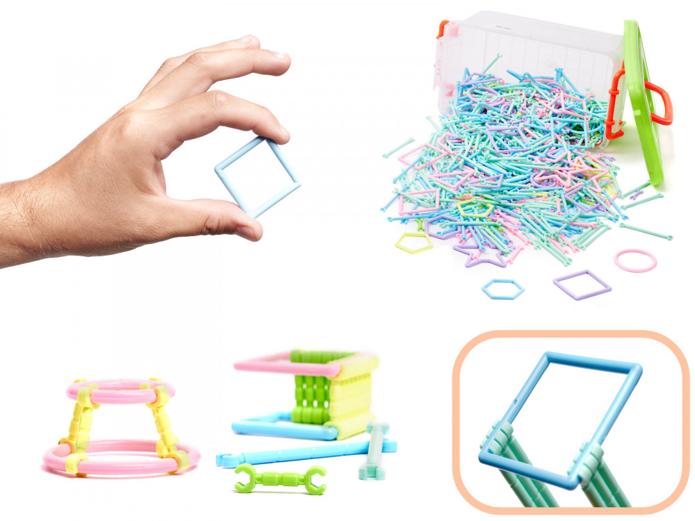 PE műanyagból készült, különböző alakú blokkokból álló készlet. A blokkok szabadon kombinálhatók egymással a fogóval ellátott pálcák segítségével, így a lehetséges projektek számának csak a blokkok száma és az építő fantáziája szab határt.
