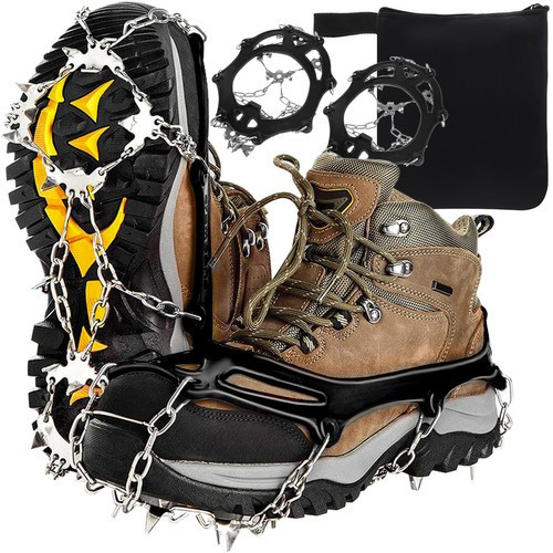 • ROZSDAMENTES ROZSDAMENTES LÁNCOK - acélból készült. Ellenállnak a rozsdának és a korróziónak. Csak húzza fel a rugalmas gallért és alkalmazza a cipő talpára . Fogantyúink nem károsítják a cipőjét, mert tökéletesen illeszkednek a cipőhöz