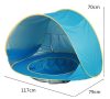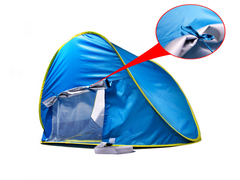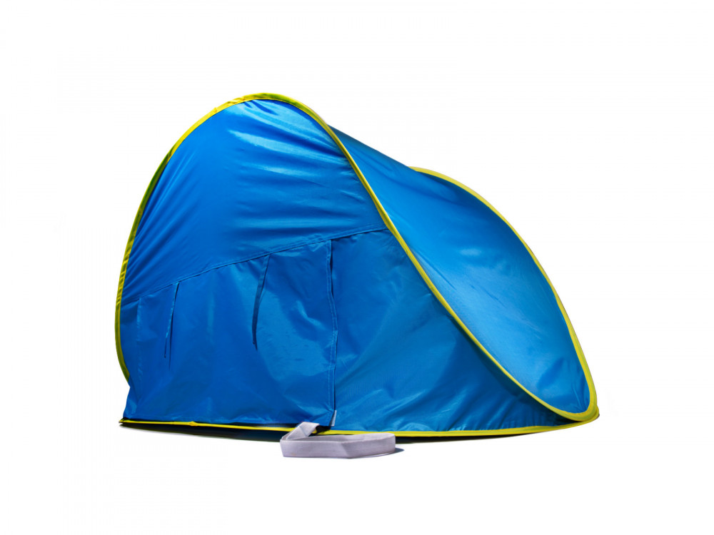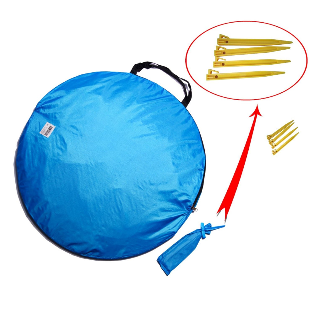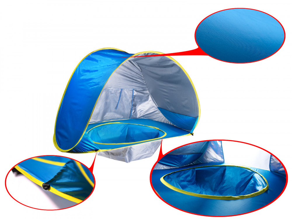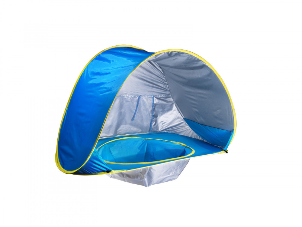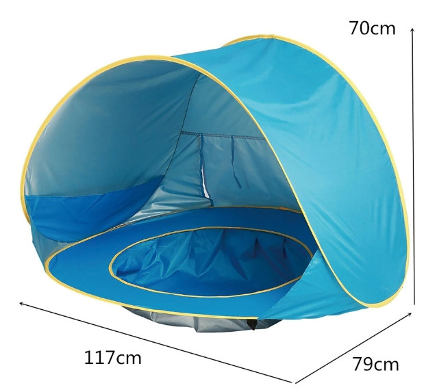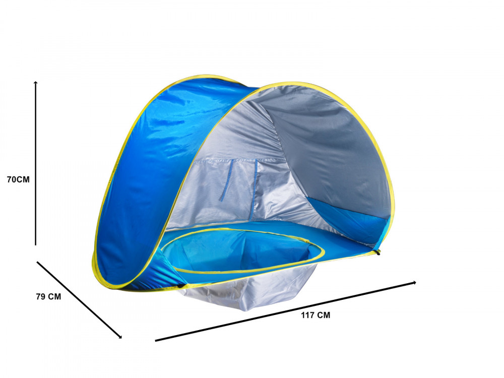 Összecsukható kék sátor külön medencetérrel. Ideális a strandra vagy a kertbe. Praktikus rovarhálóval rendelkezik. Vízálló anyagból készült. Tartalmazza a sátrat, a fedelet és 4 csapot. Méretek: 117(L)x79(W)x70cm.