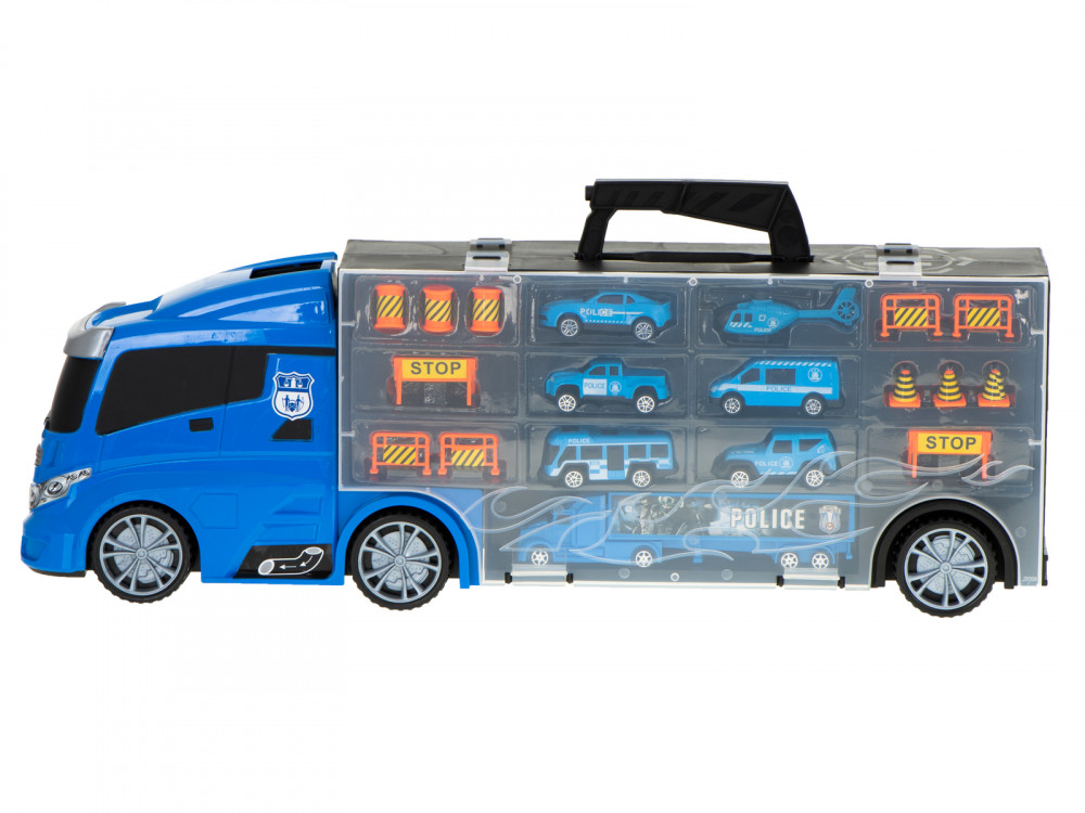 Transporter rendőrautó. Minden autórajongónak tetszeni fog. Lehetővé teszi, hogy más járműveket biztonságosan szállítson a vészhelyzet helyszínére. Mozgatható részekkel és kényelmes hordozófogantyúval rendelkezik. A teherautó méretei: 57x11 x19.5cm.