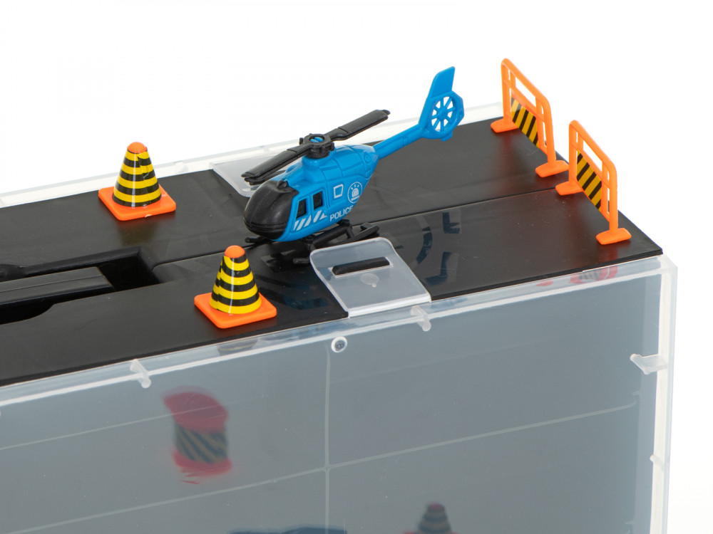 A készlet 6 járművet + helikoptert és kúpokat tartalmaz,mindent, ami egy igazi üldözéshez szükséges.