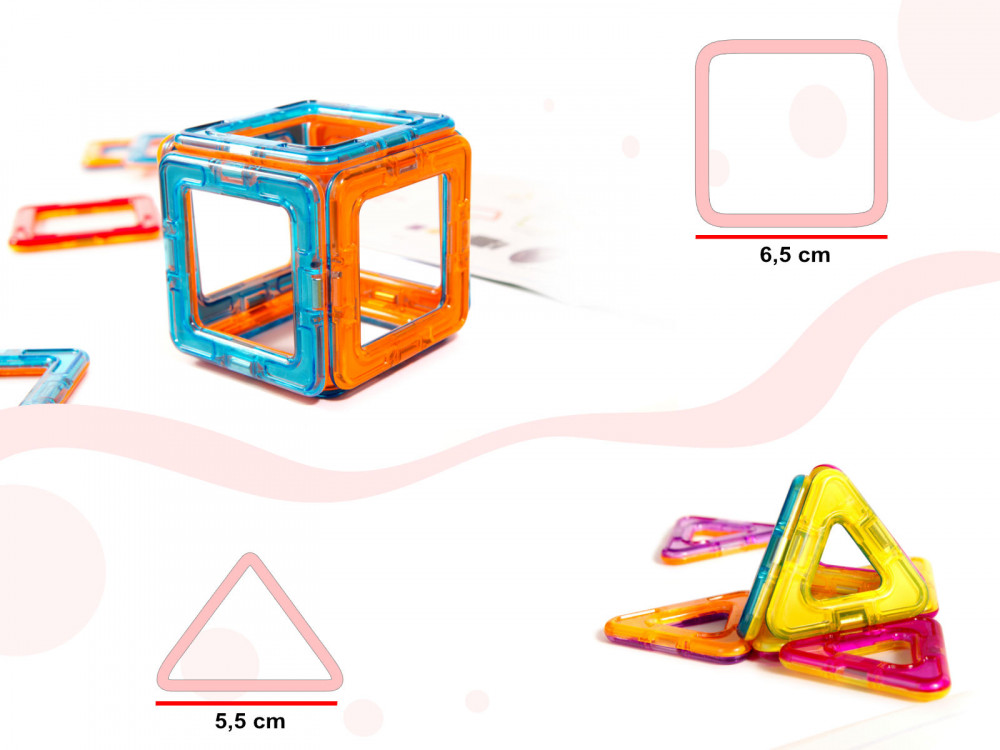 Mágneses téglákból álló 52 darabos készlet. A doboz a következőket tartalmazza: 12 háromszög 5,5 cm-es oldalakkal; 30 négyzet 6,5 cm-es oldalakkal; 2 hatszög 6 cm-es oldalakkal; alap.
