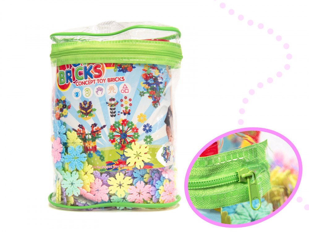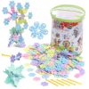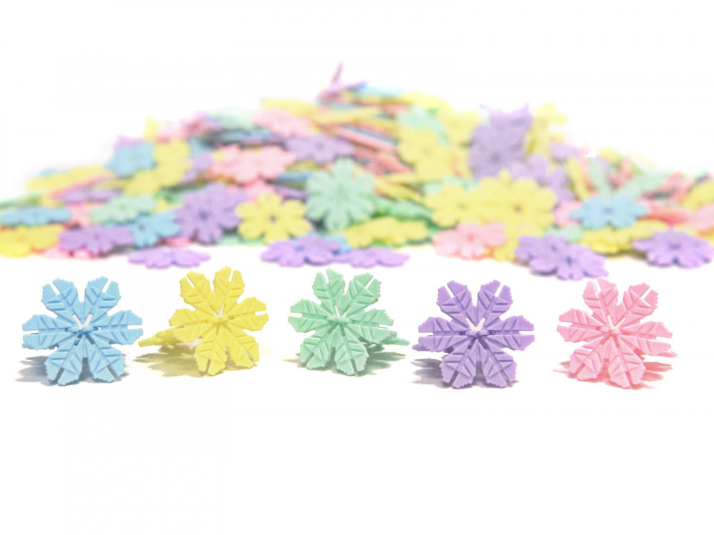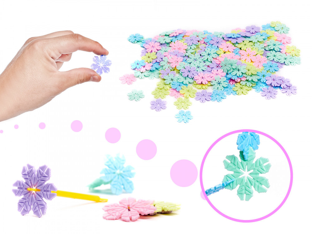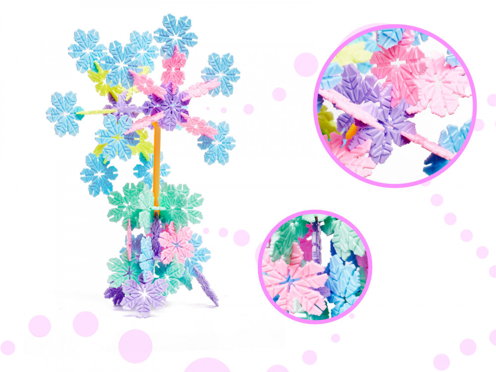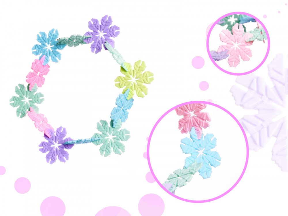 Színes, műanyagból készült, hópehely alakú téglákból álló készlet.