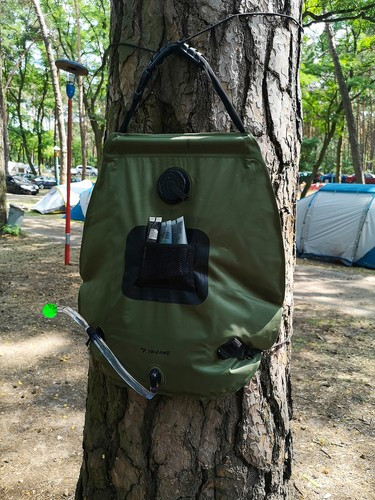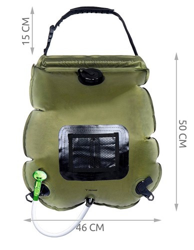 • GYAKORLATI - dupla zsebbel rendelkezik, amely lehetővé teszi a fürdéshez szükséges apróságok tárolását, pl. sampon, gél. Az oldalakon tépőzárak találhatók - ha azt szeretné, hogy a csap felfelé legyen, csak rögzítse. A csaptelep 40 centiméteres zuhanyvéggel rendelkezik, amit elég kihúzni, hogy elkezdjen folyni a víz, és használat után csak el kell zárni a vízellátást. A felső részen gumi fogantyú is található a kényelmes szállítás érdekében, valamint felfüggesztés, mindkét oldalon az alsó részen 2-2 fogantyú is található, aminek köszönhetően a felfüggesztést szilárdabban fogjuk rögzíteni, pl. fazsinór segítségével; kozmetikai táska vagy egyéb kütyü rögzítésére is használhatók.