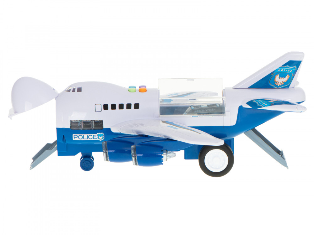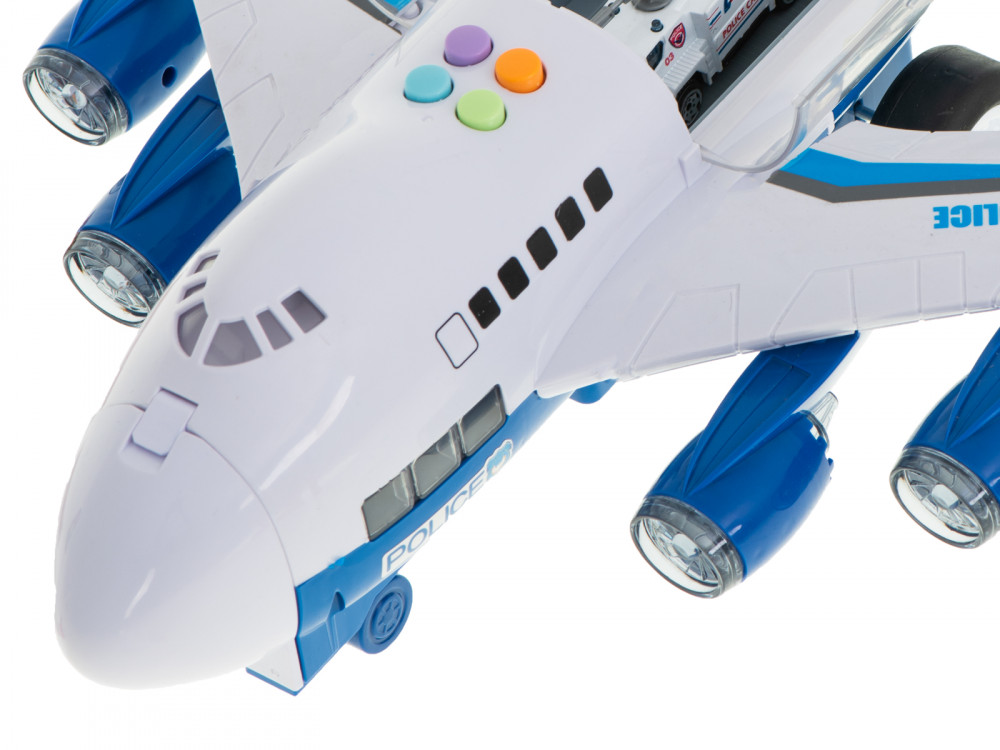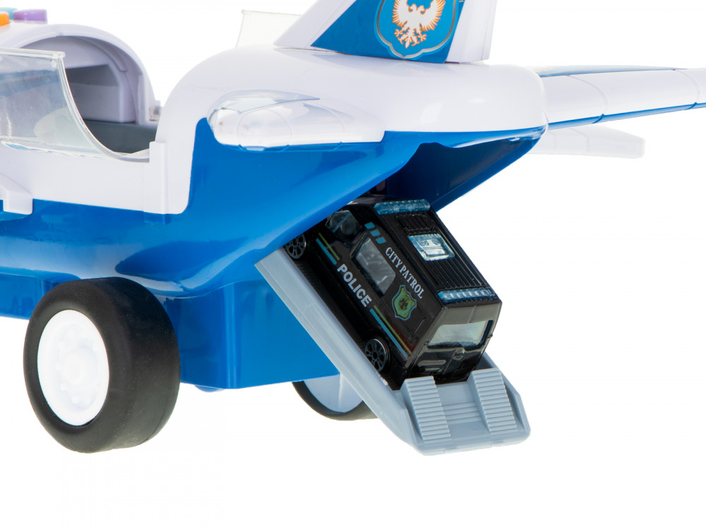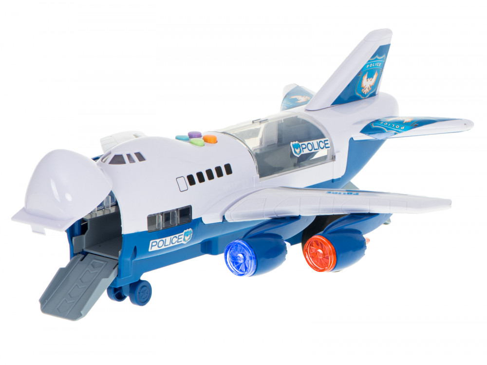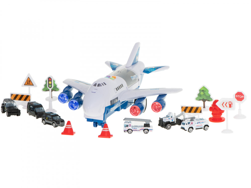 Egy nagyszerű szállító repülőgép. A játék fejleszti a gyermek koordinációját és kézügyességét. A repülőgép utastere kinyitható és megrakható autókkal. A készlet tartalmaz: repülőgép, rendőrautók, fák. Tápegység: 3x 1,5v AA (nem tartozék). A repülőgép méretei: 39x31x14cm.