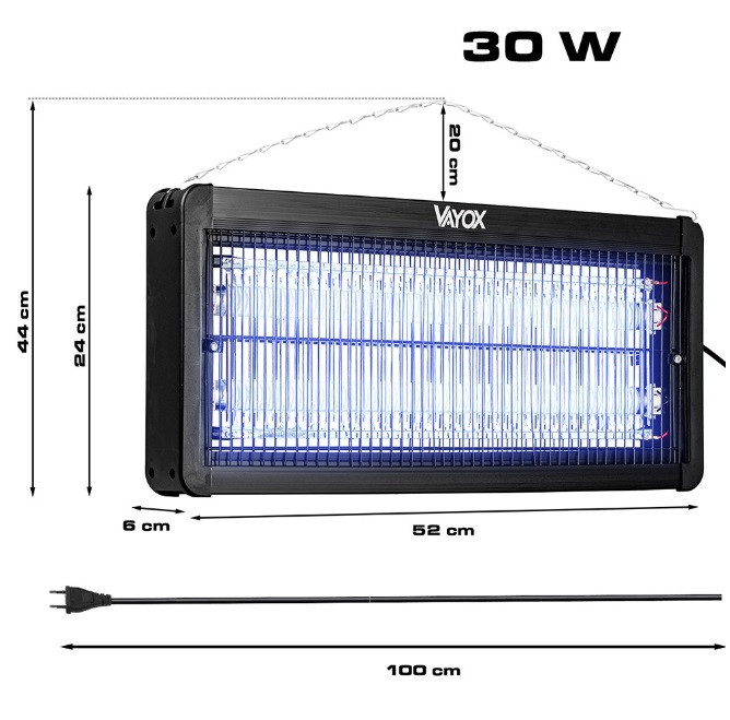 Az IKV-30W UV rovarirtó lámpa kiválóan megszelídíti az összes rovart, különösen a tolakodó szúnyogokat. A lámpa elhelyezhető és felakasztható (láncot tartalmaz). Méretek: 24 cm x 6 cm x 52 cm.