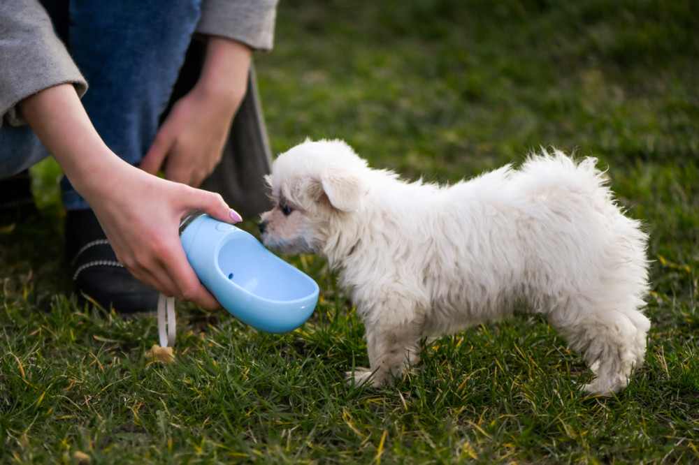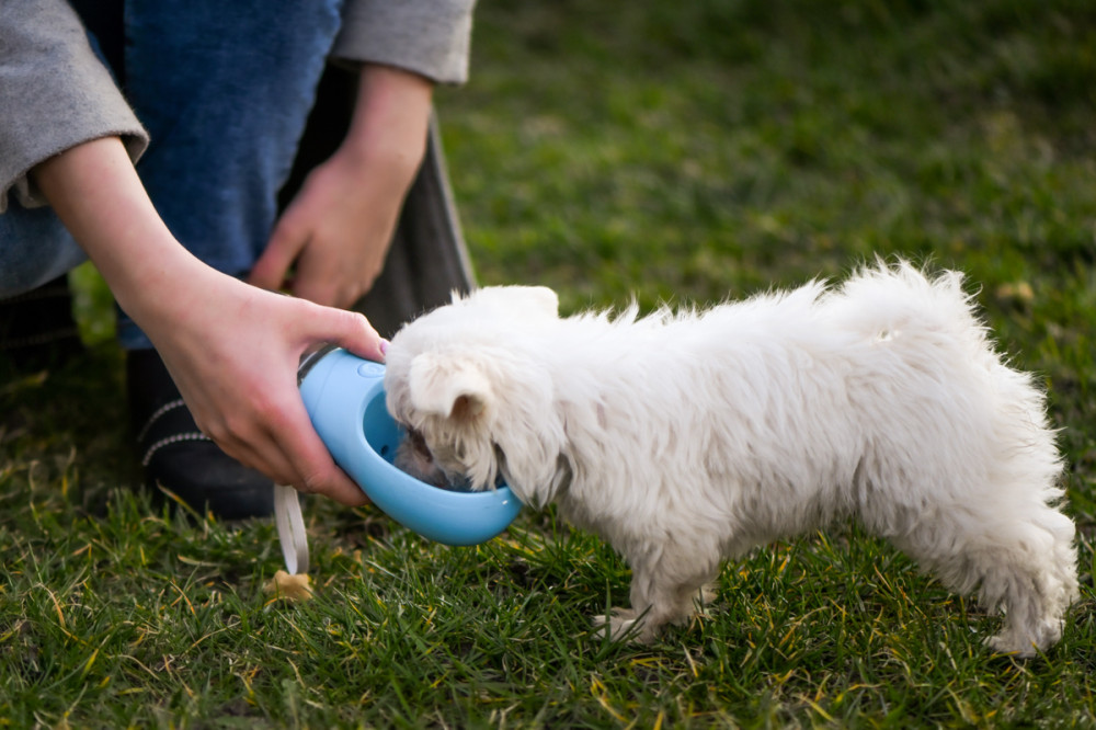 Praktikus vizes palack kutyája számára, tállal felszerelve.