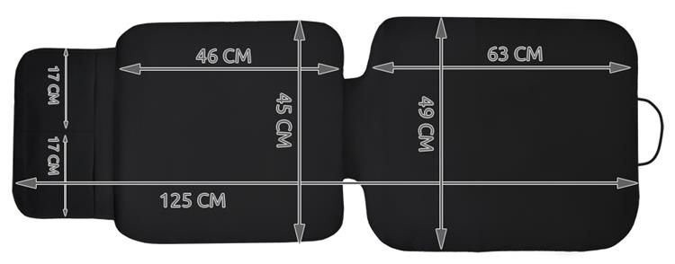 Az ülés emellett sűrű poliészterrel van bélelve, amely vízálló réteget képez. A védőszőnyeg könnyen összeszerelhető – egyszerűen hajtsa szét az ülésen, és rögzítse a fejtámlához a háttámla tetejére varrt rugalmas szalaggal. A szőnyeg alján található két zseb lehetővé teszi a szükséges dolgok tárolását.