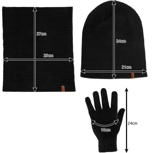 • 3 az 1-ben, ÁLTALÁNOS HIDEG ELLENI VÉDELEM – A készlet tartalmaz egy sapkát, egy sálat és egy pár kesztyűt. Az egész egységes fekete színű, anyaga amiből készült meleg akril.