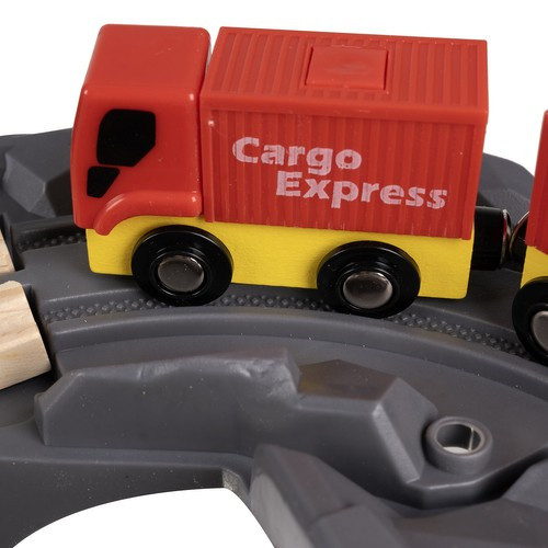 • LEÍRÁS – anyaga: fa; vonat tápegység: 1 x AA (nem tartozék); pályahossz: 4,8 m; platform méretei (híd): cm; méretei kibontva: 79 x 80 x 9 cm; súly: 2,148 kg; súlya csomagolással: 2.290 kg.