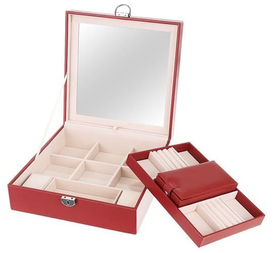 • A láda a következőkből áll: levehető fedél 2 görgős rekesszel a gyűrűknek, 4 rekesz más ékszereknek, levehető kazetta. Alatta további 6 rekesz, 2 betét az órák vagy karkötők számára és 1 nagy, téglalap alakú rekesz a nagyobb tárgyak számára. A rekeszek puha anyaggal vannak bélelve, hogy megvédjék a kényes ékszereket a karcolásoktól.