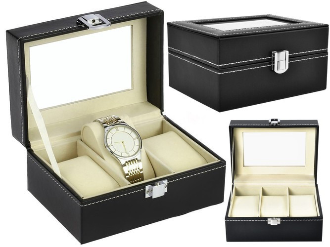 Az elegáns óradoboz 3 rekesszel rendelkezik, melyben nem csak órákat, hanem egyéb ékszereket is elhelyezhet. A doboz elegáns fekete színű és fehér varrással rendelkezik, ami eleganciát és stílust kölcsönöz az egésznek. Az óratartó doboz fedele átlátszó, aminek köszönhetően az óradoboz nemcsak tárolásra, hanem a tartalom elegáns megjelenítésére is használható.