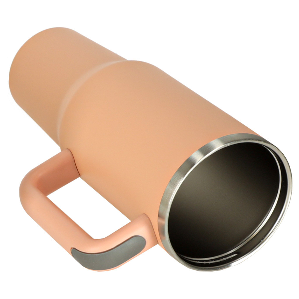 Nagyméretű, 1,2 literes, púderrózsaszínű termo bögre fogantyúval. Rozsdamentes acélból és műanyagból készült, duplafalú szigeteléssel. Szivárgásmentes termo bögre acél fogantyúval és szívószállal, ideális forró és hideg italokhoz.