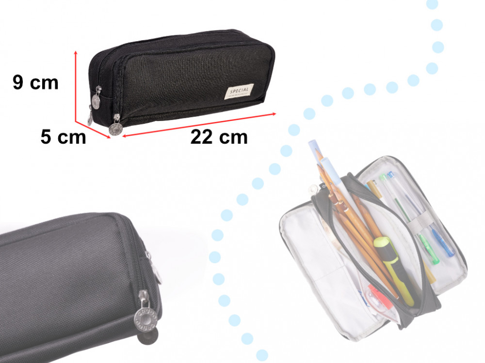 Egy szenzációs hármas tasakos tolltartó. Sminktáskának is tökéletes. A tágas tasakban minden szükséges tárgy elfér. A rekeszek száma: 3 cipzáras. Szín: fekete. Anyaga: poliészter.A tolltartó méretei: 22x5x9cm.