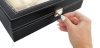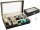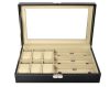 Az elegáns dobozban 3 rekesz van a szemüvegeknek és 6 rekesz az óráknak, amelyekbe egyéb ékszereket is elhelyezhet. A tok elegáns fekete színű és fehér varrású, ami eleganciát és stílust kölcsönöz az egész. A tok fedele átlátszó, aminek köszönhetően az órák és szemüvegek doboza nemcsak tárolásra és rendben tartásra használható, hanem a tartalom elegáns megjelenítésére is.