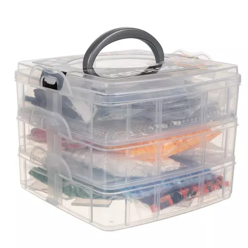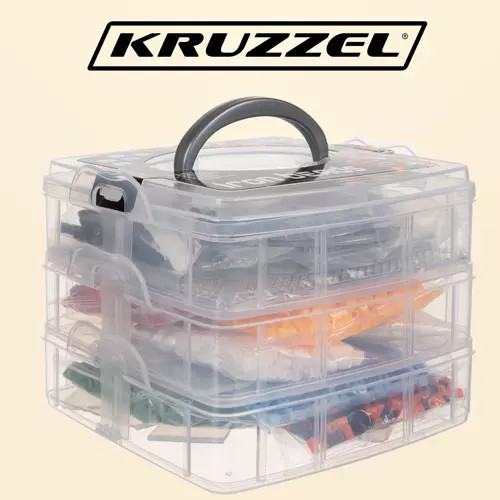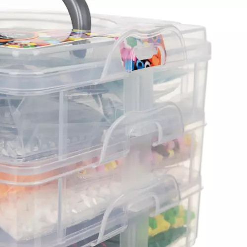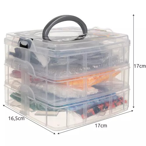 • Az egész egy 3 szintes tartóba van csomagolva, 2 emeleten rekeszek vannaka gyöngyöknek, a harmadik emeleten pedig egy nyitott rekesz van a kiegészítőknek. Minden emelet reteszekkel záródik, és a szervező hordozó fogantyúval rendelkezik.